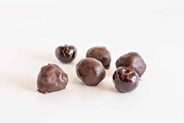 4 דובדבני אמרנה ממולאים במרציפן ועטופים בשוקולד מריר.
