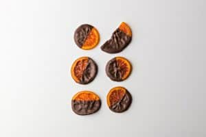 חצאי פלחי תפוז מסוכרים בעבודת יד טבולים בשוקולד מריר – 140 גרם